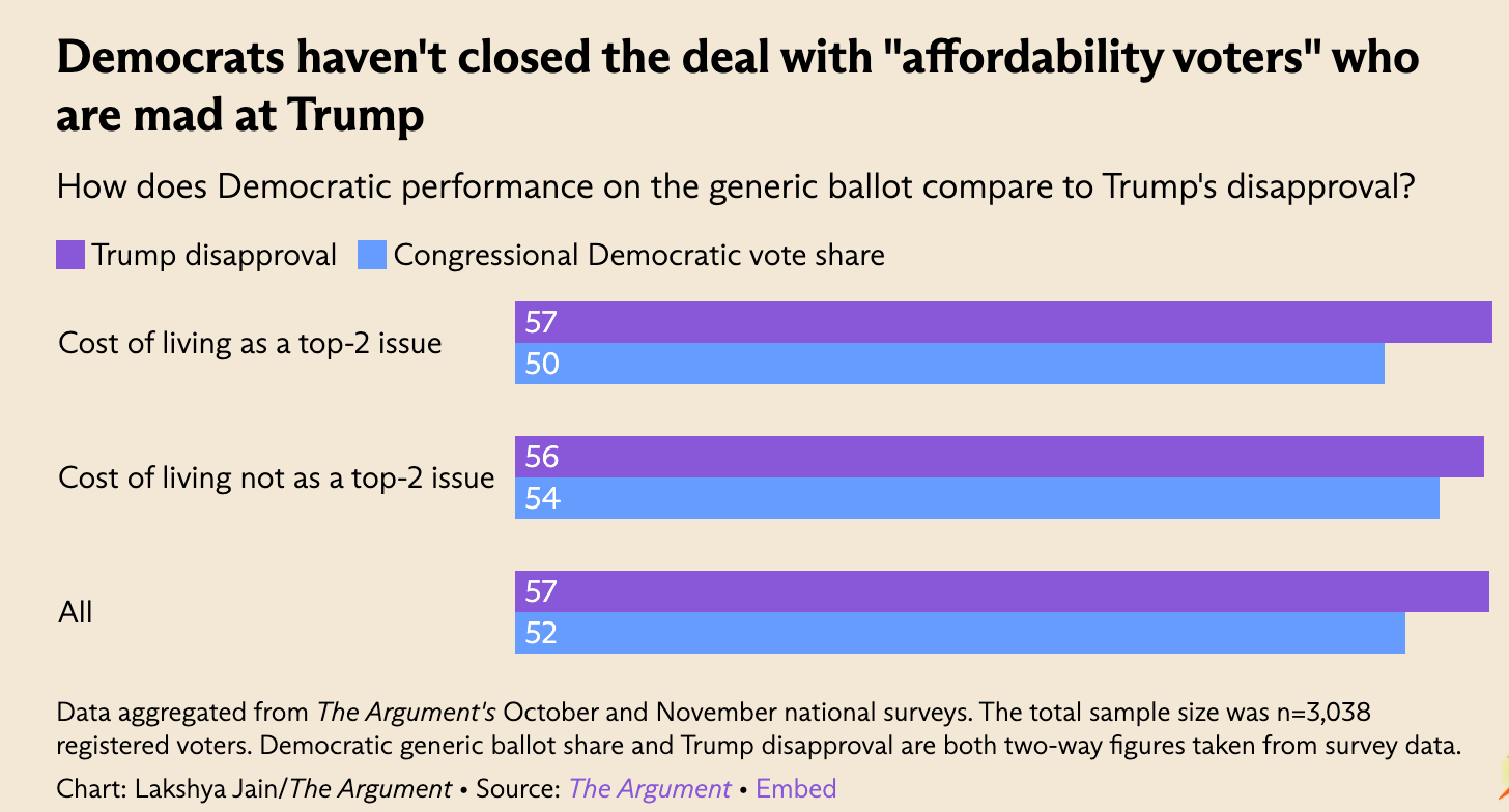 A majority of voters disapprove of Trump’s performance on the economy, and that disapproval is especially strong among people who say the cost of living is a top concern. But here’s the problem: Democrats still haven’t converted that frustration into a supermajority of trust, even among voters who rank cost of living as a top-two issue. In other words, many voters are mad at Trump, but they’re not yet convinced Democrats will actually make their lives more affordable. Heading into 2026, closing that gap has to be the party’s central task: not just opposing Trump’s economic record, but clearly, relentlessly demonstrating how Democratic policies will lower prices and raise living standards.