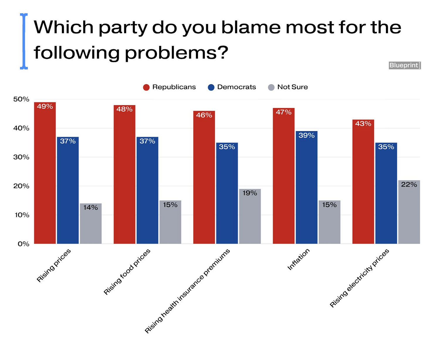 “That is the pain point right now with voters,” one Democratic strategist told Reuters — everything from groceries to utilities feels increasingly unaffordable. Seeing an opening, Democrats are framing the election as a referendum on affordability, and, implicitly, on Trump’s economic record. New polling from BluePrint Research shows that as much would like to claim any negative score on the economy is out of his hands, voters are finally starting to label rising prices, and the economy as Trump’s doing.