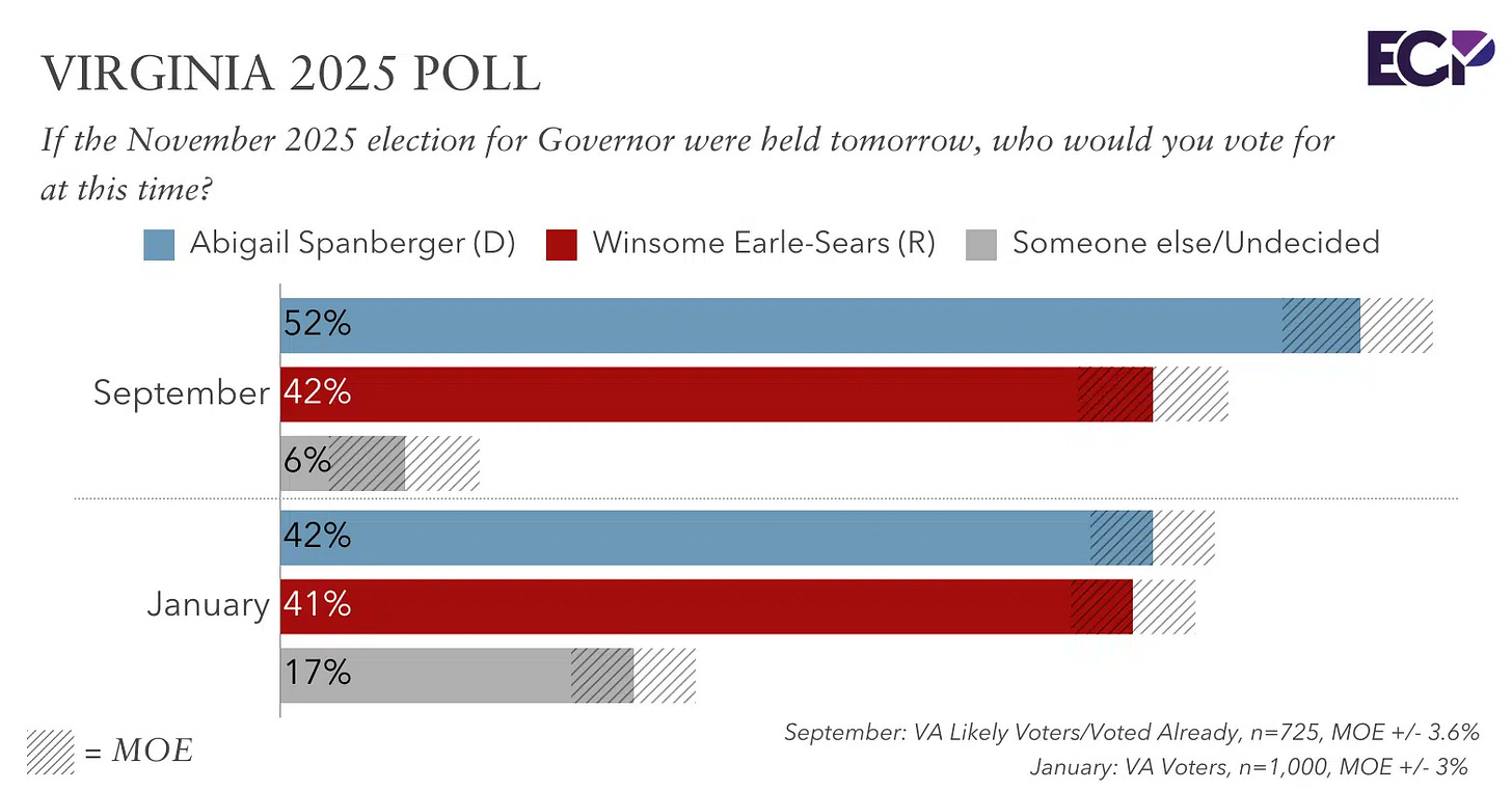 While there has been a lot of chatter online, if these candidates have what it takes to win, looking at polling data allows us to paint a better picture to see how their constituents are responding to the race in real time. Polling across both gubernatorial races shows Democrats holding steady but competitive leads as affordability dominates voter concerns. In Virginia, recent surveys from Emerson College and the VCU Wilder School place Abigail Spanberger ahead of Winsome Earle-Sears by 7 to 10 points, with Spanberger outperforming among independents (+11), younger voters, and suburban men — groups that helped propel Glenn Youngkin’s 2021 victory.