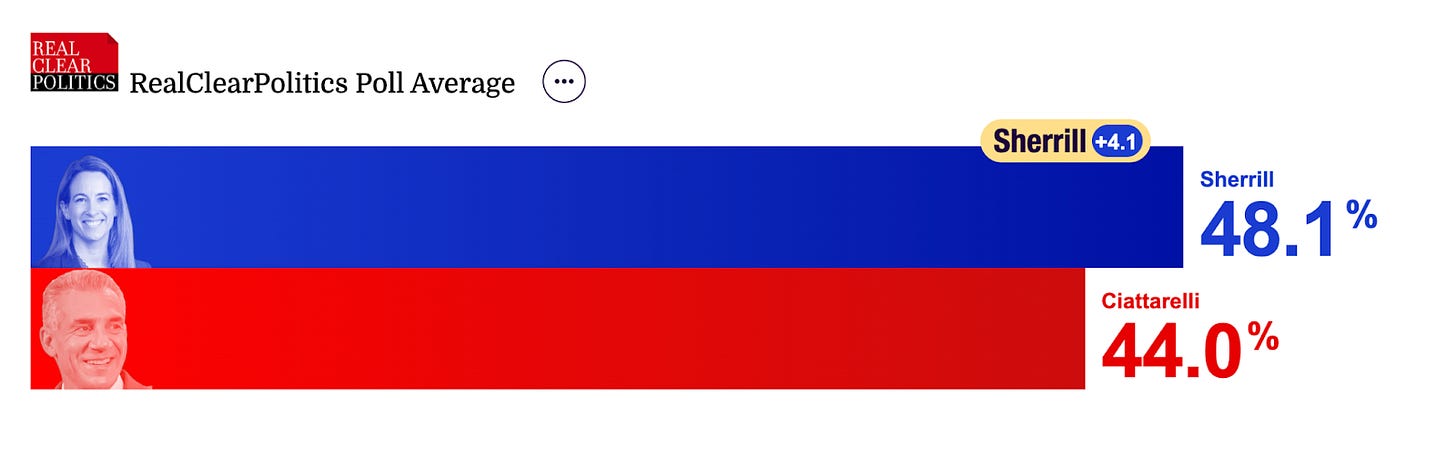 In New Jersey, Mikie Sherrill maintains a slimmer but consistent edge over Jack Ciattarelli, averaging a 4 to 6 point lead across RealClearPolitics and Rutgers-Eagleton polling. Quinnipiac’s September poll showed Sherrill up eight, powered by suburban moderates and women who cite cost-of-living issues as decisive.