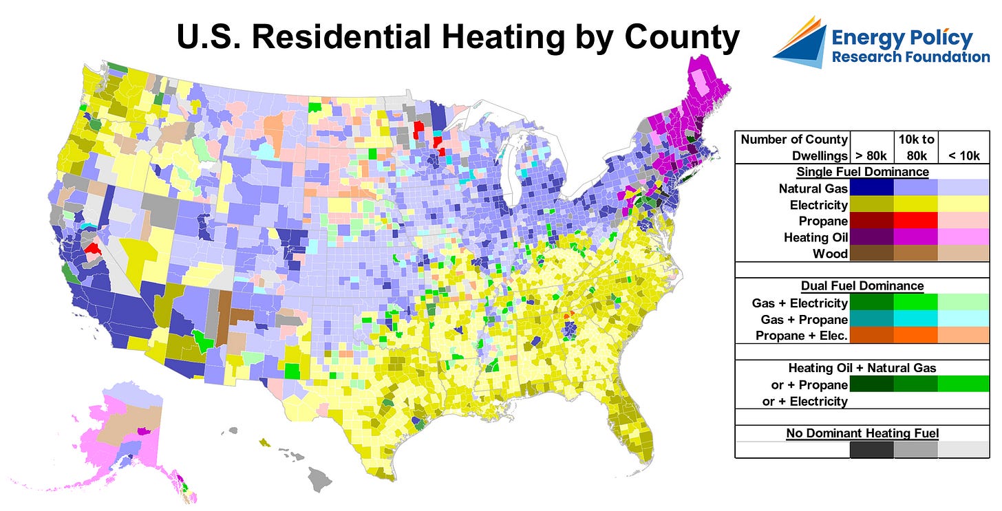 It is important for Democrats to recognize that when it comes to making heating affordable, there’s really no good substitute, at least in the short term, for natural gas. Here you can see a map of the dominant heating sources in different parts of the country. As you can see, northern New England still uses a lot of heating oil, but most of the rest of the Northeast (as well as urban areas across the country) mostly uses natural gas.