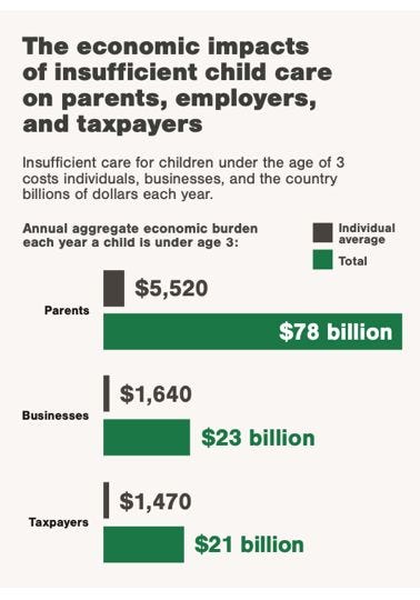 This is beginning to have spillover impacts on our overall economy. A recent report found that the U.S. infant-toddler child care crisis now costs $122 billion annually in lost earnings, productivity, and tax revenue—more than double the 2018 estimate. Parents face frequent work disruptions, which women are disproportionately impacted by, leading to $78 billion in lost income, while employers lose $23 billion and taxpayers lose $21 billion yearly.