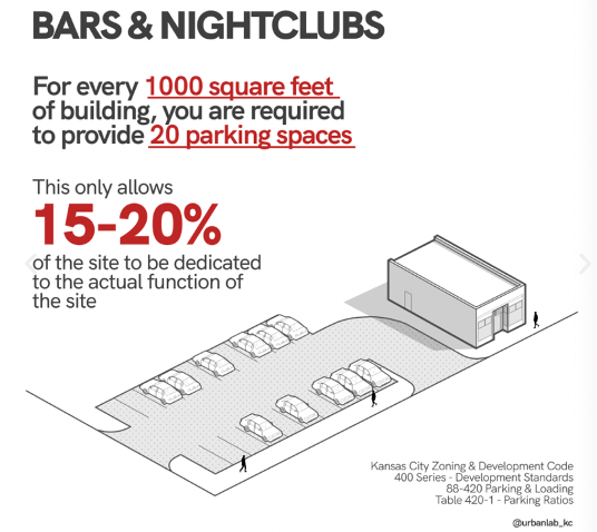 In Los Angeles, churches must have a parking spot for every 5 pew seats. In Charlotte, daycares must have a parking spot for every ten kids (plus one for every worker). Kansas City requires bars to have so many parking spots that only a fifth of the land is usable, which arguably encourages drunk-driving.
