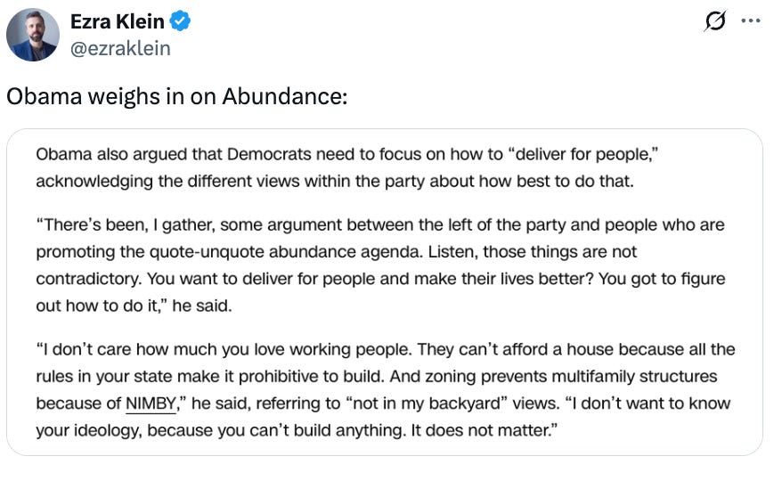 As Ron Davis wrote in The Atlantic, too many on the left have mistaken the YIMBY movement, key allies in the overall “abundance movement”, for a conservative project, when it's actually about breaking the chokehold of entrenched interests that hoard wealth and power. In housing, that means tackling zoning rules manipulated by incumbent homeowners. In healthcare, it means loosening restrictive licensing laws that serve legacy gatekeepers. We should reject the false dichotomy that traps us in a zero-sum worldview.