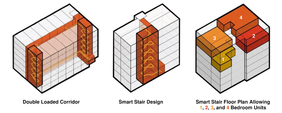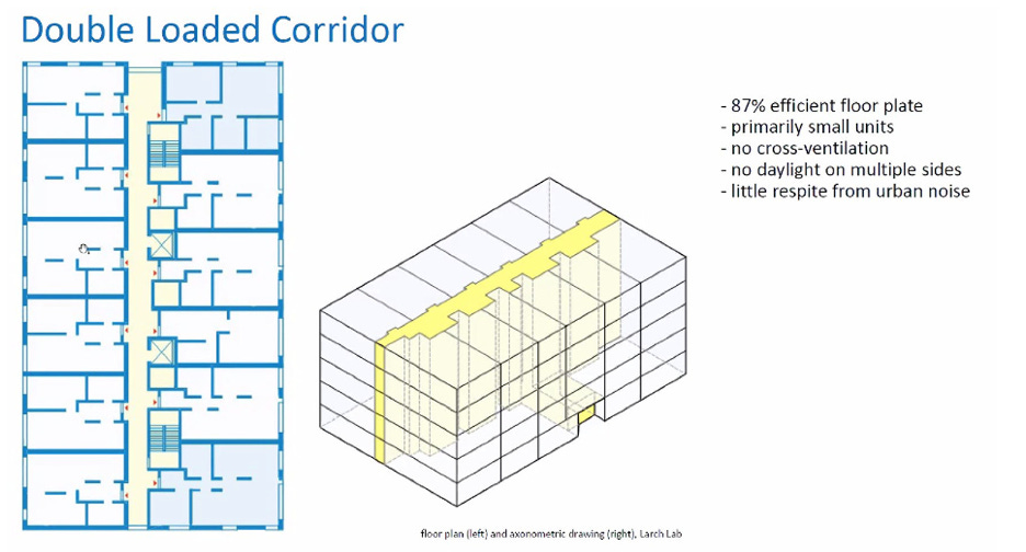 Not only are double stairway mandates not necessary, they all but force developers into that double loaded corridor style of apartment construction. The apartments they build then have numerous drawbacks: worse ventilation, less natural light, and rigid, repetitive layouts. This design works decently enough for one and two bedrooms but not for three or more bedrooms. This makes it a lot harder for developers to build apartments that are sized for and cater to families’ needs (for example having a larger master bedroom and two smaller bedrooms).