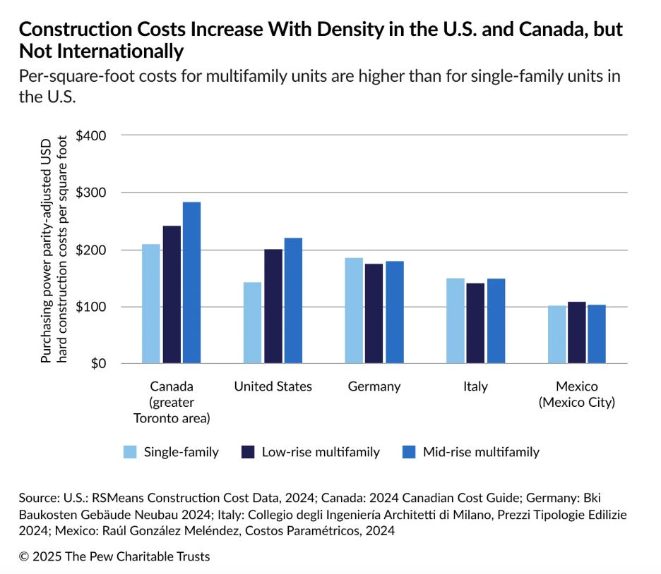 Similar rules allowing for single-stair building are present in many other countries. Most of the developed world builds residential buildings with single stairways, and their fire safety records are excellent—often better than ours. Sweden, Norway, Germany, the UK, Spain, and Switzerland all allow single-stair buildings of six, eight, or even more stories. These aren’t reckless countries gambling with their citizens’ lives. They’re wealthy, safety-conscious nations that have thoroughly studied fire safety and reached the conclusion that you don’t need two stairways to do sound fire safety. It very much is possible for us in America to reform these mandates without undermining fire safety. Pew has an excellent review of the research on this and it shows that “single-stairway four-to-six-story apartment buildings have fire performance at least as good as their two-stairway counterparts.”