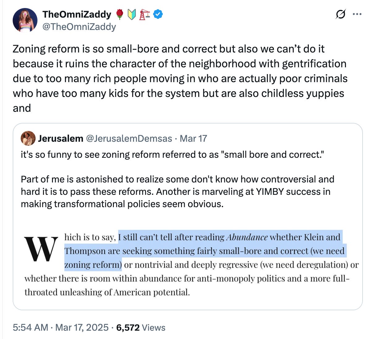 This highlights the disconnect when advancing zoning reform or the critics that have emerged discussing the recent Abundance book by Ezra Klein and Derek Thompson, who spend a good part of the book on breaking down how vetocracies have hampered our ability to build, critics like Zephyr Teachout have dismissed the fight surrounding zoning reform as “smallbore and correct,” which vastly undermines the difficulties and obstacles that arise when trying to pass these housing initiatives.