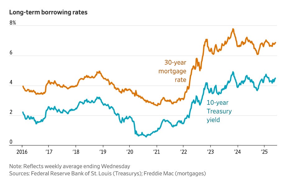 Trump’s largest domestic legislation, the Big Beautiful Bill is also fiscally reckless. It pushes deficits $3 trillion higher over ten years (and they were already approaching 2 trillion a year). Investors are starting to worry about lending us more money so now borrowing costs are rising. That impacts consumers when they need to borrow money for a house or a car. As you can see here, mortgage rates are strongly correlated with the 10-year T-note, i.e. how much it costs the government to borrow.