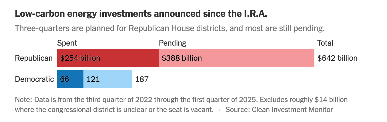 Finally, the extent to which Republicans are hurting their own constituents is somewhat shocking. Three-quarters of the investments at risk are in Republican districts, yet their representatives seem determined to undermine their own constituents' economic prosperity.
