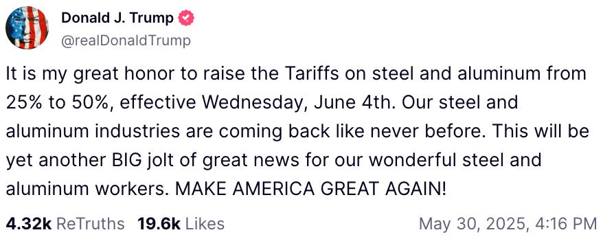And just as expected, Trump doubled down and now in effect tomorrow, he is increasing steel and aluminum tariffs from 25% to 50% under Section 232 national security provisions.