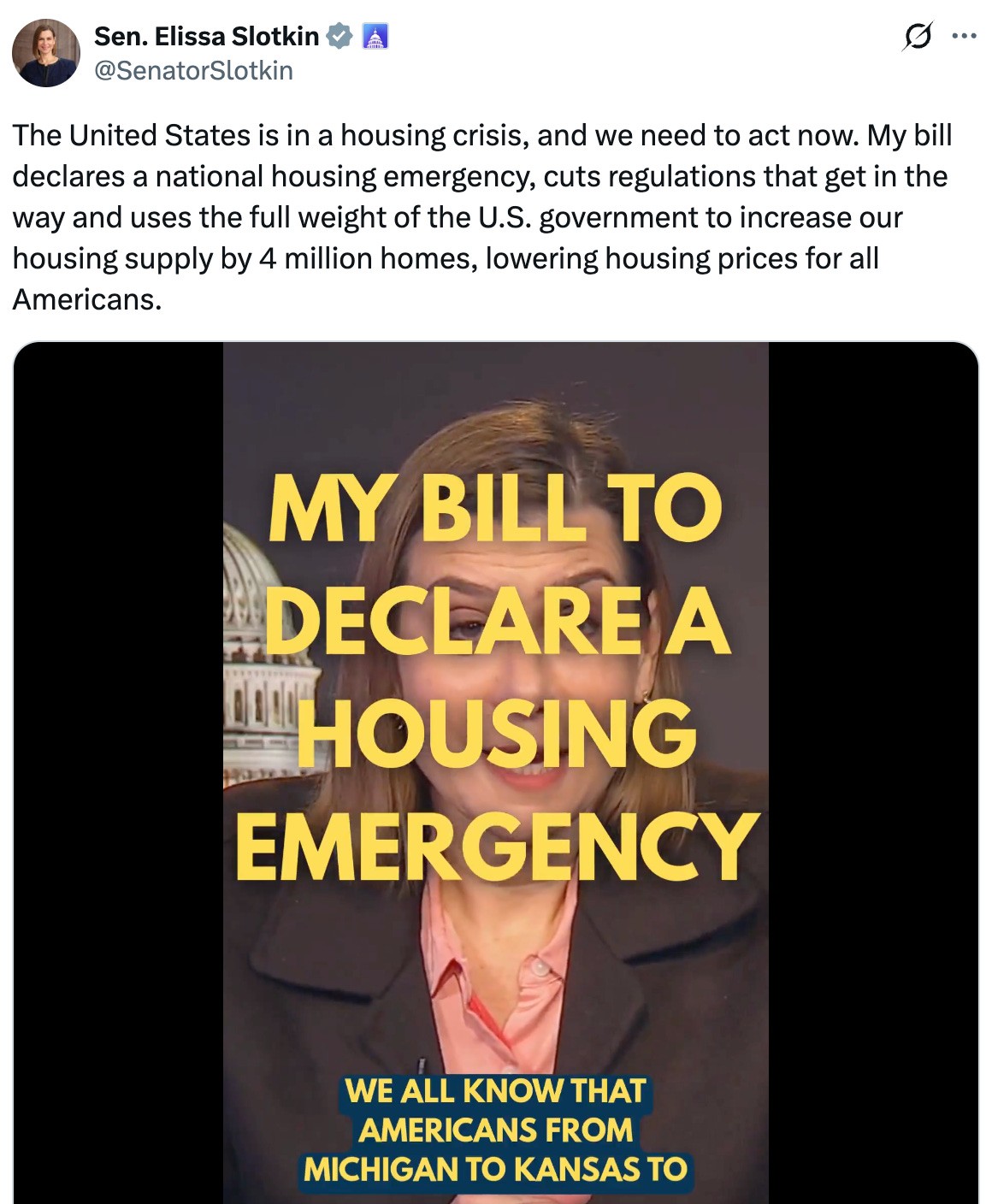 Sen. Elissa Slotkin introduced a bill declaring a national housing emergency and using federal authority to cut through state and local barriers that block housing construction. The proposal would preempt regulations that impose a “substantial burden” on building or rehabilitating housing, with the goal of increasing supply by 4 million homes and lowering housing costs.