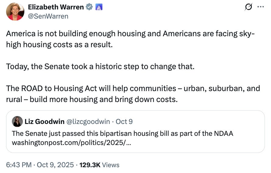 Special shout-out to the ROAD to Housing Act of 2025, which just passed the Senate! It’s now off to the House — read our full write-up on what’s inside here.