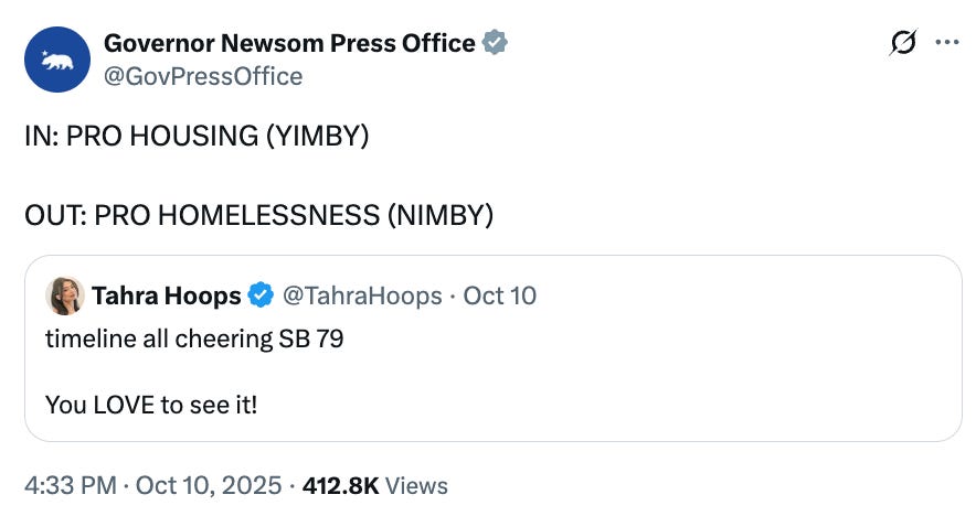 The win of the week obviously had to go to Governor Newsom’s Press office for this tweet. (It is not biased at all, of course!) But seriously, SB 79 was a major victory, and the pro-housing package he signed along with it. No more saying we need to focus on the cost of living, we need our officials to start acting on it! So we must celebrate when that happens.