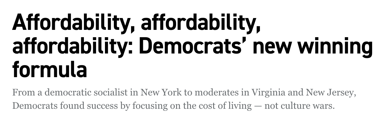 Democrats won key races in New York, New Jersey, and Virginia by centering their campaigns on affordability and the high cost of living, rather than cultural or ideological battles. Candidates Zohran Mamdani, Mikie Sherrill, and Abigail Spanberger — spanning from Democratic socialists to moderates — united around promises to lower costs for housing, utilities, and childcare, showing that economic concerns can bridge the party’s ideological divides and appeal to working- and middle-class voters ahead of the 2026 midterms.