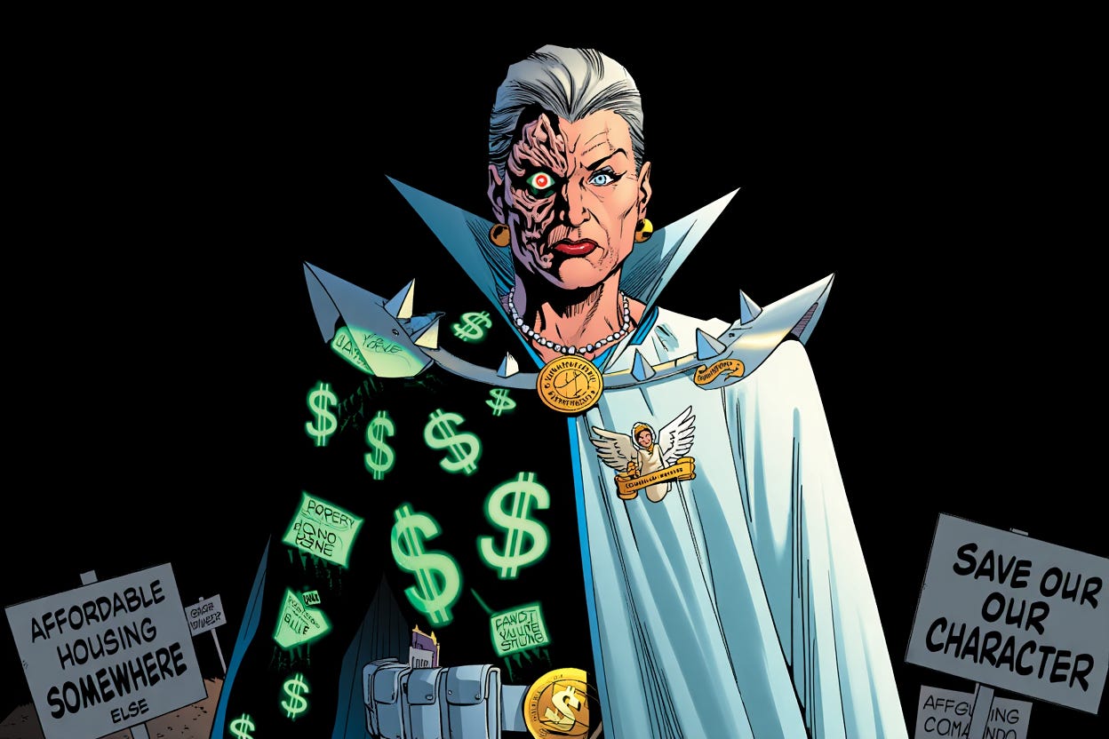 The NIMBY prowls the neighborhood with her split personality, one face weeping crocodile tears about "neighborhood character" and traffic concerns, while the other coldly calculates her property values. Like Batman’s nemesis Two-Face, she flips a coin at every zoning meeting: Heads, she claims to care about the environment while blocking dense new housing in underutilized urban areas; tails, she pretends to support affordable housing, just nowhere near her and definitely not in the form of apartments that might cast a shadow. Her ultimate superpower is transforming reasonable sounding civic concerns into weapons of exclusion, forcing teachers, nurses, and young families to live elsewhere. But hey, at least she doesn’t have to experience anything around her ever changing.