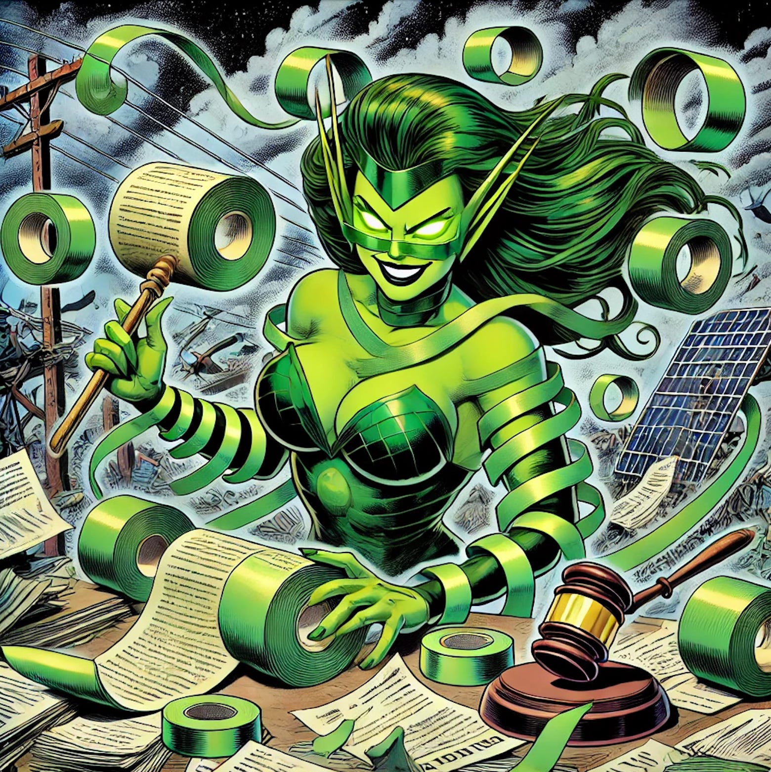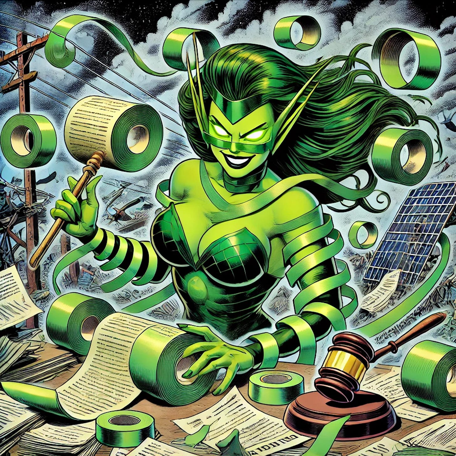 The Green Tape Goblin emerges from the shadows whenever America tries to build something useful, wielding her arsenal of multi-year long environmental impact studies, consultation requirements, and endless appeals processes. With a cackle of bureaucratic glee, she wraps critical infrastructure projects in so many layers of regulatory green tape that they either die a slow, expensive death or emerge years later as budget-busting monsters. Her superpower? Turning a simple solar farm or transmission line into a decade-long legal odyssey that costs ten times the original estimate!