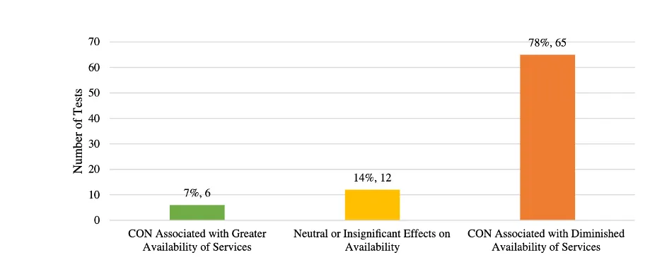 These are not cherry-picked results. Of 83 statistical tests done by researchers on CON laws, just 7% find an association between CON laws and greater availability of services while 78% of them find that CON laws are associated with diminished availability of services. CON laws don’t make sense to keep. Getting rid of them will not fix all of American healthcare but it will lead to more competition, better health care services, and lower prices.