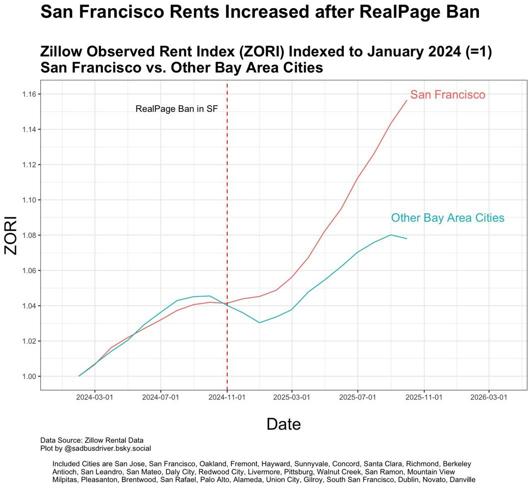 The hoped-for rent relief never materialized. In fact, San Francisco rents continued climbing after the ban. According to market data, city rents jumped by in the following year (roughly 9% increase). Apartments index showed the average San Francisco apartment rent reaching about $3,110 by mid-2025 – up from around $2,849 pre-ban. With San Francisco housing still nearly 154.6% more expensive than the national average. While correlation doesn’t always equal causation, the trend is hard to ignore: banning the pricing software did not stop rents from rising.