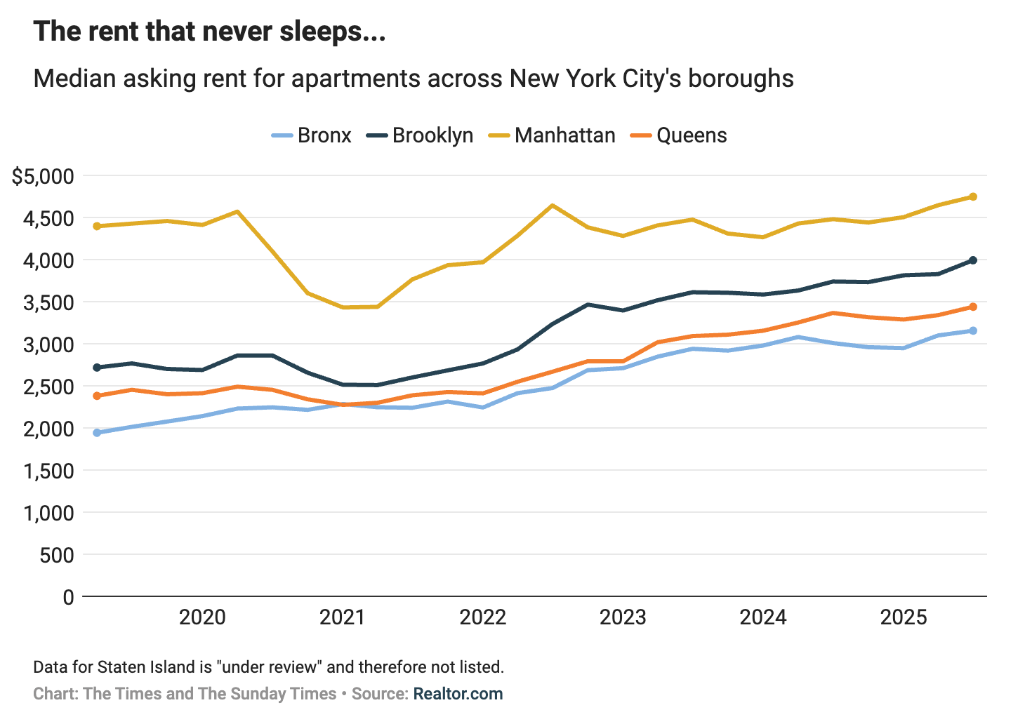 That didn’t happen. By October 2025, Manhattan’s median rent reached a record $4,747/month, up 3.3% year-over-year. Brooklyn and Queens also saw increases.a healthy market.