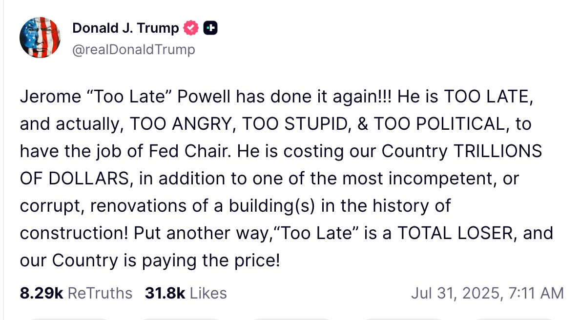 The third way Trump is undermining the dollar is by attacking Jay Powell and the Federal Reserve — the very institution responsible for maintaining confidence in American currency. Trump has spent months publicly berating Powell for not cutting interest rates fast enough.