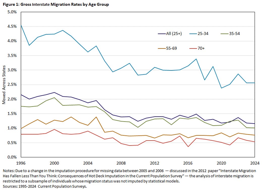The paralysis isn’t only in the job market – it’s also at our front doors. Americans have stopped moving houses at rates unseen in modern history. In 2021, only about 8.4% of Americans changed residence, the lowest share since tracking began in 1947. For three years running, mobility has remained below 10% of the population – whereas post-World War II rates were twice as high, around 20% moving annually. The U.S. has become a nation of stayers.